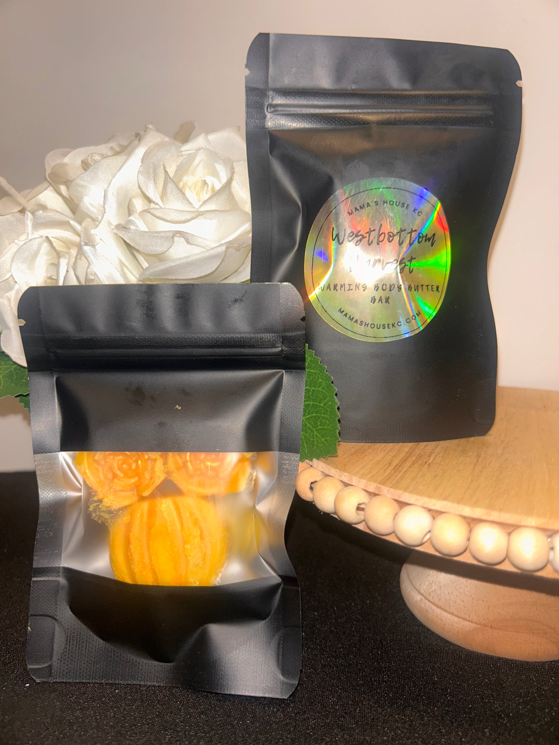 Our signature Westbottom Harvest scent combines the cozy warmth of pumpkin, calming lavender, and creamy coconut milk, creating a luxurious body butter bar that melts into your skin with a gentle warming sensation.